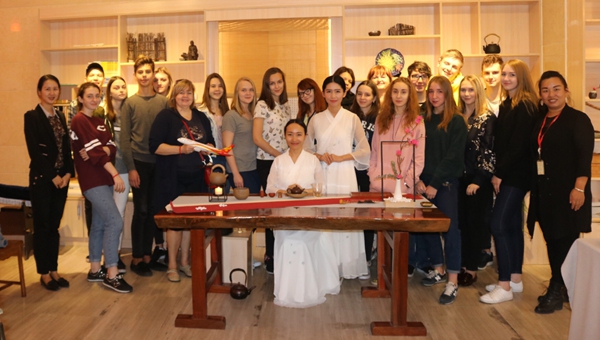 俄罗斯中学生在茶艺室合影