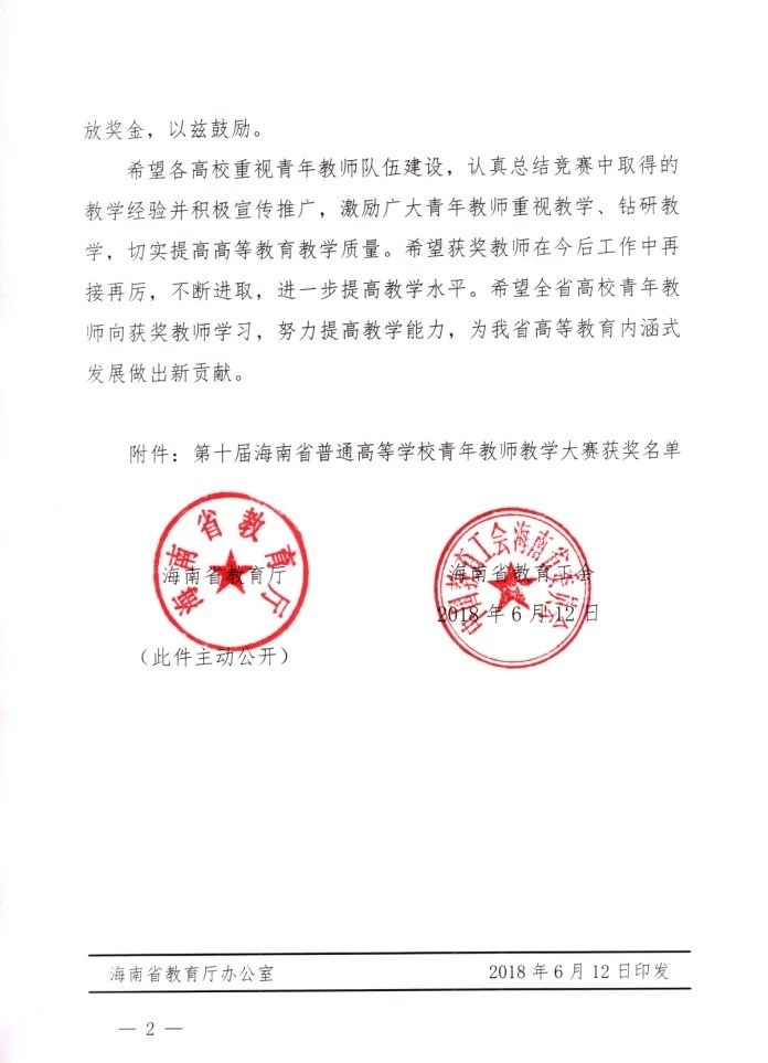 本次比赛成绩的取得是两位老师坚持学习、重视教学、不断钻研取得的结果,是对教师的付出与表现的重要肯定及荣誉,更是学校教务处及各职能部门、二级学院、专家团队共同付出的结果。海南省青年教师教学大赛,不仅检验了青年教师的教育教学水平,也是为培养更多优秀的青年教师提供了一个很好地锻炼的平台及展示交流的机会。此次我校蝉联海南省青年教师教学大赛一等奖,是我校近年来内涵建设和师资建设取得丰硕成果的充分证明。学校重视青年教师队伍的建设,青年教师是学校的未来,学校以此为契机,总结本次青年教师教学大赛经验,调动和发挥教学研究小组、教学比赛小组的力量,积极宣传推广,以促进我校青年教师快速成长。