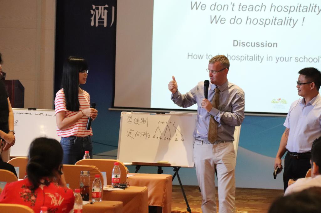 John Daly用富有激情的语言、表情和丰富的肢体动作,为大家分享了瑞士款待业的发展及现状,SEG的教育理念、教学模式,未来产教融合的模式以及激发学生积极性的方法。周龙先生祖籍湖南,旅居瑞士10年,他结合自己对中西方教育和文化的理解,以及自身求学、创业、以及多年海外教育教学的经验,用比较的方法和生动的案例,为大家分享了国际酒店业现状及面临的挑战,国际旅游与款待业的最新趋势,未来旅游业的发展方向,未来酒店和旅游院校的发展趋势以及SEG的人才培养模式和实训教学体系。杨结先生围绕中国旅游与酒店行业及专业人才培养模式的发展、变革及未来方向做了精彩的报告。培训期间,还前往三亚金茂丽思卡尔顿酒店进行了现场学习与交流。