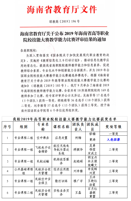 2019年10月18日,海南省教育厅正式了公布2019年海南省高等职业院校技能大赛教学能力比赛评审结果。我校六个教学团队从参赛队伍中脱颖而出,喜获佳绩。其中,何梅团队获一等奖,并入选国赛;顾振华、赵晓硕两个团队获二等奖;刘李雅、穆广宇、王晶三个团队获三等奖;同时,我校获优秀组织奖且获奖数量在海南高职院校位居第一。