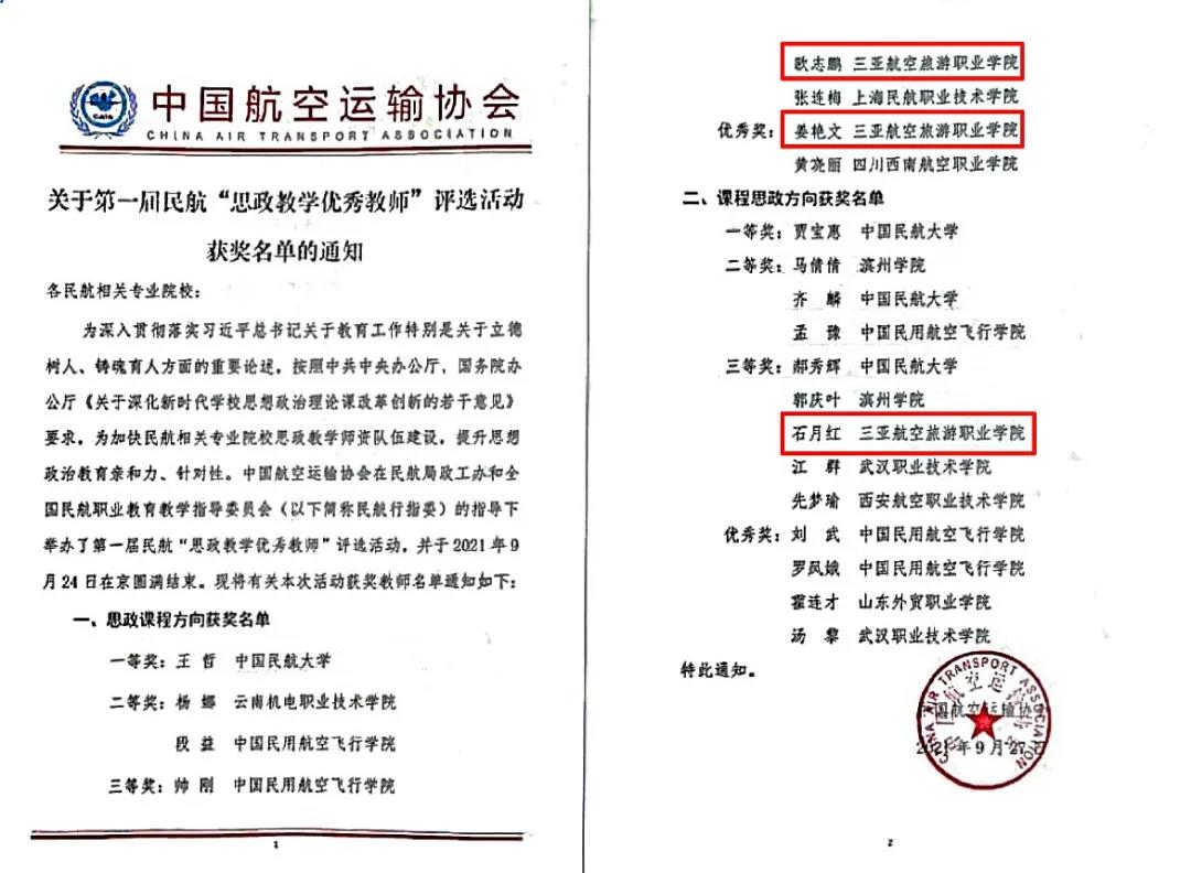 9月27日,中国航空运输协会公布第一届民航“思政教学优秀教师”评选活动获奖名单,我校欧志鹏荣获思政课程方向三等奖,姜艳文荣获思政课程方向优秀奖,石月红荣获课程思政方向三等奖。