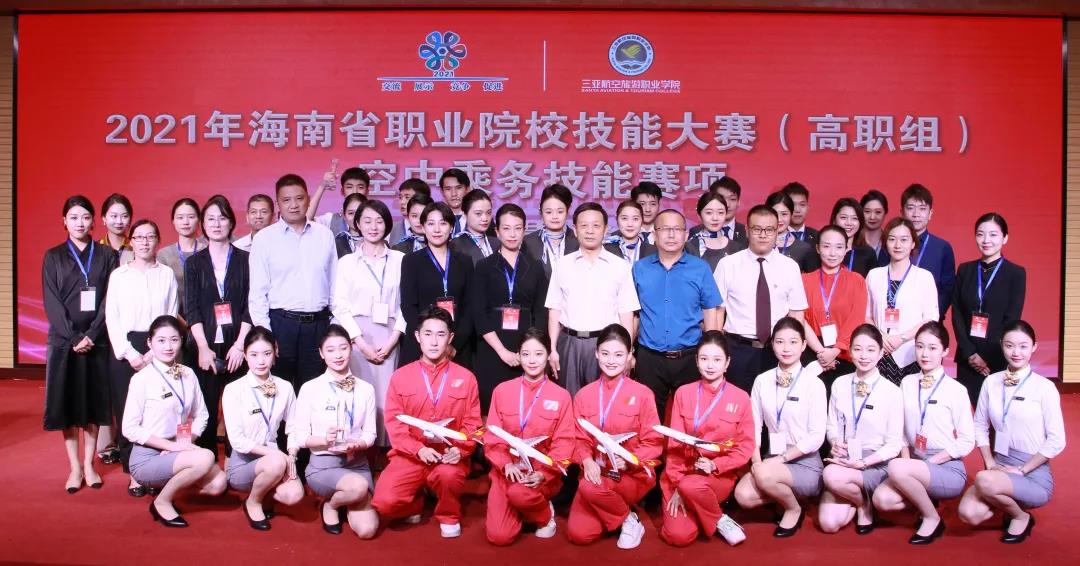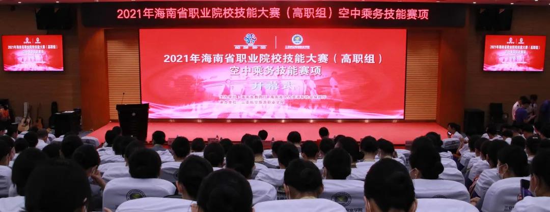 为深入贯彻落实《国家职业教育改革实施方案》,坚持德技并修、工学结合,深化产教融合、校企合作,通过大赛平台,及时了解空中乘务行业领域技术最新发展趋势,充分展示职业教育改革发展的丰硕成果,集中展现我省职业院校空中乘务专业师生的风采,以赛促学、以赛促教,提升海南省职业院校空中乘务专业建设和人才培养质量,更好地为海南自由贸易港经济建设和社会发展输送优秀人才,由海南省教育厅、海南省人力资源和社会保障厅主办、我校承办的2021年海南省职业院校空中乘务技能大赛于2021年10月25-26日顺利举行。