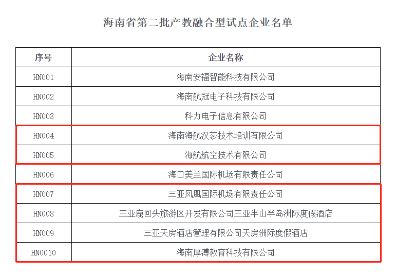 2021年11月26日,根据省发展改革委、省教育厅、省人力资源和社会保障厅联合印发的《关于开展第二批产教融合型企业建设培育工作的通知》(琼发改社会〔2021〕401号),公示了海南海航汉莎技术培训有限公司等10家企业纳入产教融合型企业建设信息储备库。我校推荐的六家合作企业全数获批海南省产教融合型企业建设培育单位,包括海南海航汉莎技术培训有限公司、海航航空技术有限公司、三亚凤凰国际机场有限责任公司、三亚鹿回头旅游区开发有限公司三亚半山半岛洲际度假酒店、三亚天房酒店管理有限公司天房洲际度假酒店、海南厚溥教育科技有限公司。