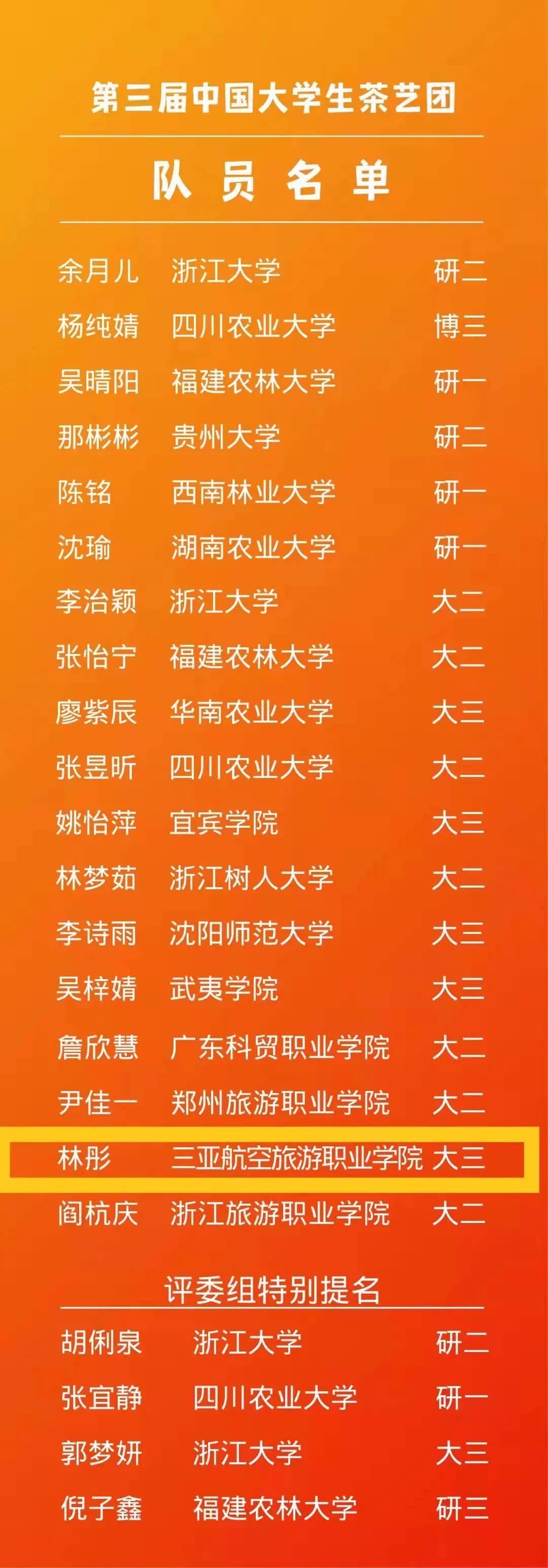 2022年1月24日,第三届中国大学生茶艺团评选结果公布,我校2019级乘务学院空中乘务专业学生林彤凭借出色的形象气质、过硬的专业技能、精彩的个人才艺,通过层层选拔,成功入围第三届中国大学生茶艺团队员名单。此次全国共有22人入选第三届中国大学生茶艺团,其中高职院校生4名,林彤为海南省唯一入选,将作为中国茶文化使者,面向国际,肩负起宣传推广灿烂悠久的中国茶和中国茶文化的历史使命。