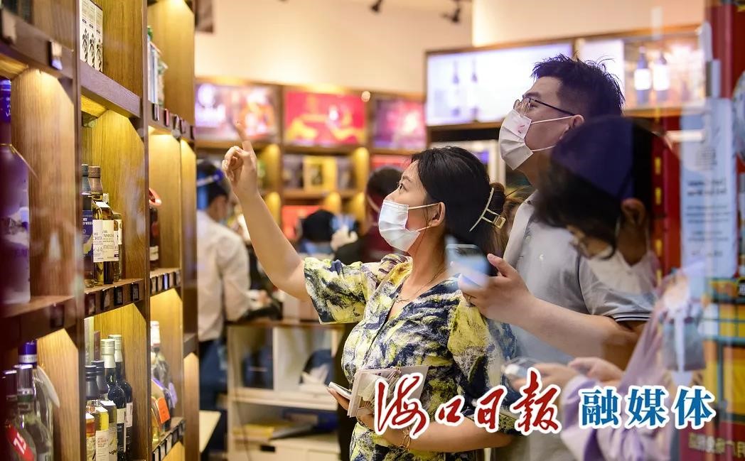 海口日月广场免税店内,消费者在选购酒类产品(图片来自:海口日报)