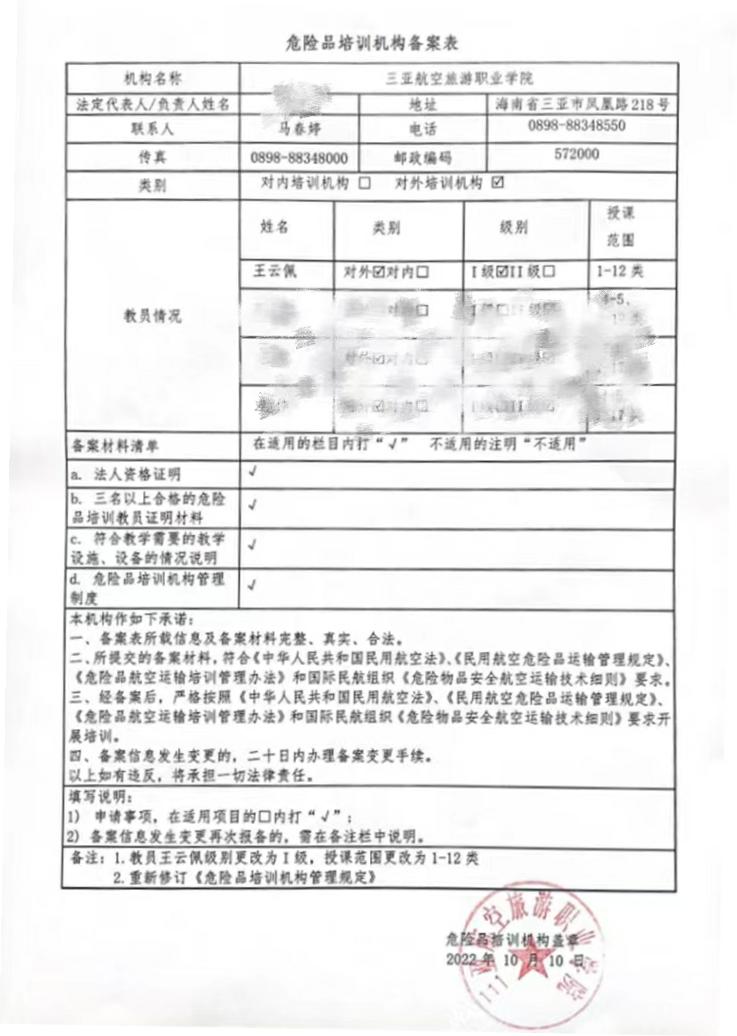 我机构自成立以来,坚持以党建为引领,机构成员均为中国共产党党员,机构严守规章制度,严把培训质量,高度重视教员的业务能力提升与思想政治教育,筑牢机构成员民航安全意识。2020年起机构开始培养对外Ⅰ级教员,两年来教员通过外训学习、一线挂职锻炼、集中备考,今年王云佩教员凭借扎实的功底,一举通过对外Ⅰ级教员能力评估,并已通过局方备案审核。本机构现拥有一名对外Ⅰ级危险品教员和三名对外II级危险品教员,可对1-17类人员进行培训,目前我校培训机构是三亚地区唯一一家具有对外Ⅰ级培训资质的培训机构。