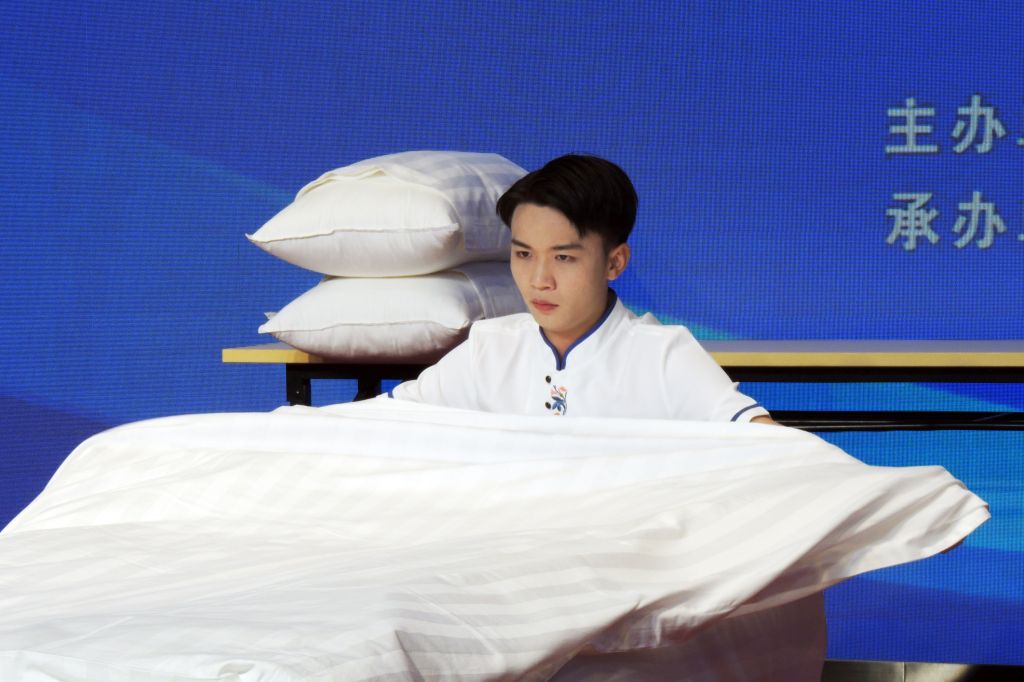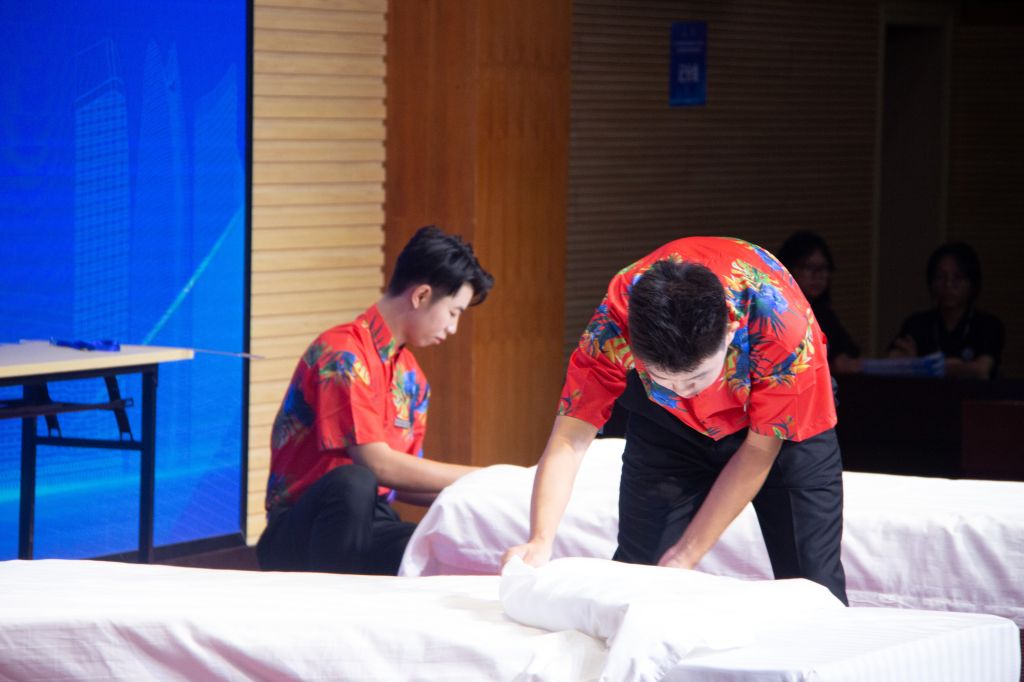 理论知识测试结束后,进行现场操作展示。现场操作包含选手的仪容仪表展示、中英文自我介绍、中式铺床和开夜床主题创意设计及解说。此环节主要考察选手操作的熟练性、规范性,以及夜床主题设计的创意性。