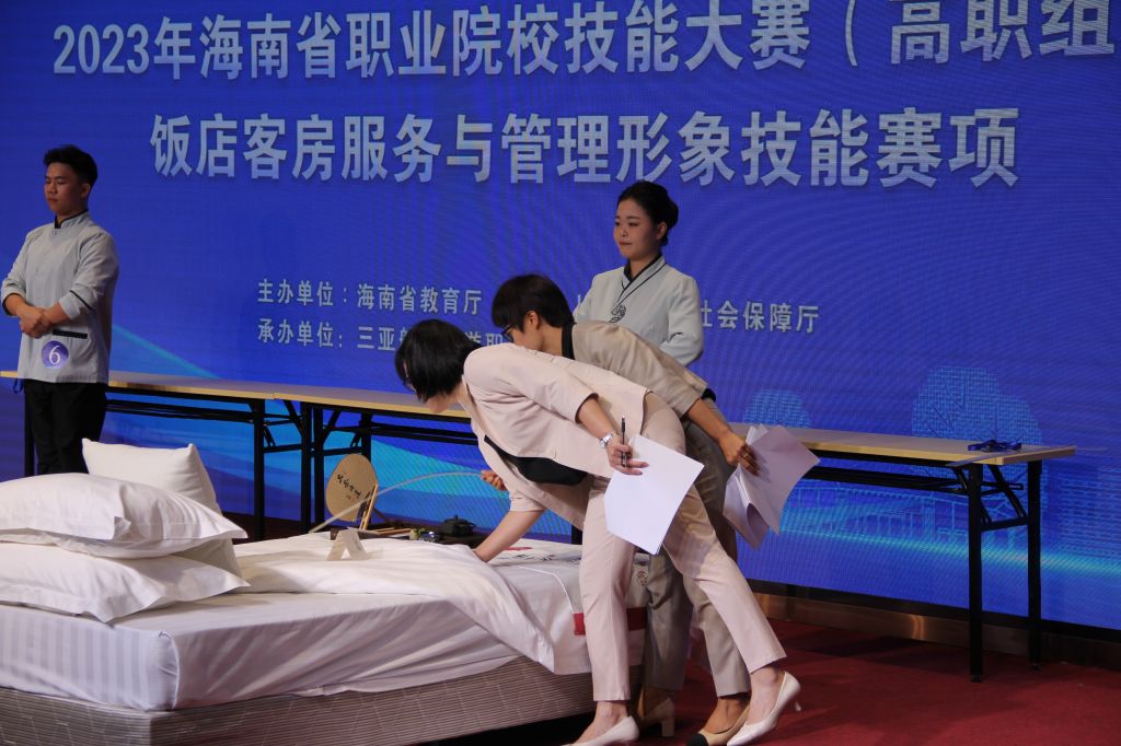 为落实新修订《中华人民共和国职业教育法》和《国家职业教育改革实施方案》,提升职业院校泛服务类专业建设和人才培养质量,为海南自由贸易港经济建设和社会发展输送优秀的旅游酒店高技能人才,由海南省教育厅、海南人力资源和社会保障厅主办,beat365正版唯一官网承办的2023年海南省职业院校技能大赛(高职组)饭店客房服务与管理形象技能大赛于10月24日至25日顺利举行。本次大赛参赛队伍共20名选手同台角逐。经过激烈的角逐,我校荣获小组总成绩第一、第三和第六的好成绩。