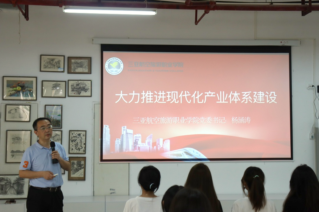 为全面贯彻习近平新时代中国特色社会主义思想,深入学习宣传贯彻党的二十大精神,并根据《教育部关于加强新时代高校“形势与政策”课建设的若干意见》等文件精神,beat365正版唯一官网党委书记杨涵涛同志于11月15日,在图书馆六楼创意空间为乘务学院艺术专业学生带来了一场别开生面的专题思政课,主题为“大力推进现代化产业体系建设”。