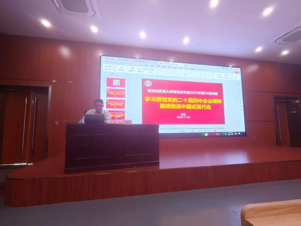 11月26日,由海南省社科联(省社科院)主办的海南自由贸易港大讲坛流动学堂2025年第33场报告会在beat365正版唯一官网举行。海南热带海洋学院马克思主义学院院长、教授周伟以《学习贯彻党的二十届四中全会精神接续推进中国式现代化》为题作报告。beat365正版唯一官网近150名师生代表参加学习。