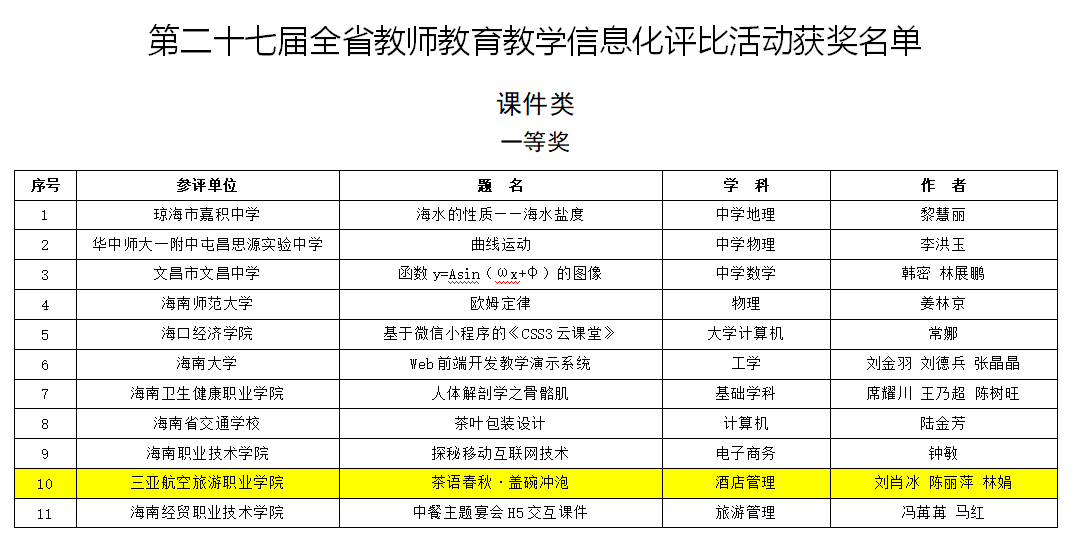 近日,由海南省教育厅主办的“第二十七届全省教师教育教学信息化评比活动”的比赛结果正式出炉,我校参赛作品《茶语春秋·盖碗冲泡》,荣获课件类一等奖。