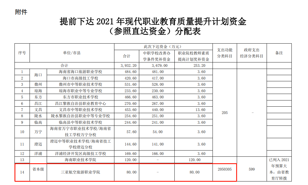日前,提前下达2021年现代职业教育质量提升计划资金(参照直达资金)分配表出炉,三亚航院作为省本级单位入选,此次获2021年现代职业教育质量提升计划资金的海南省省本级单位仅2家。